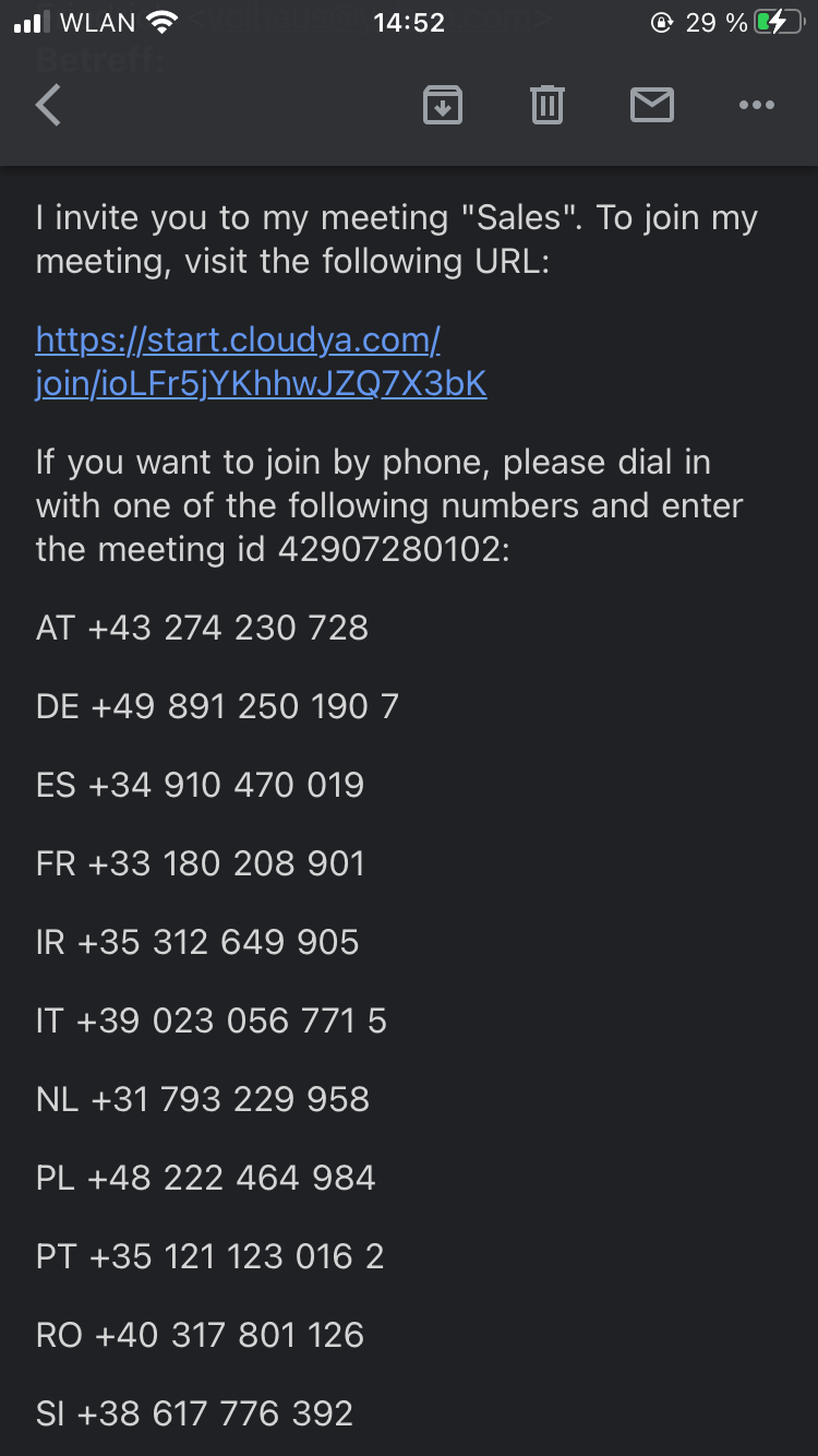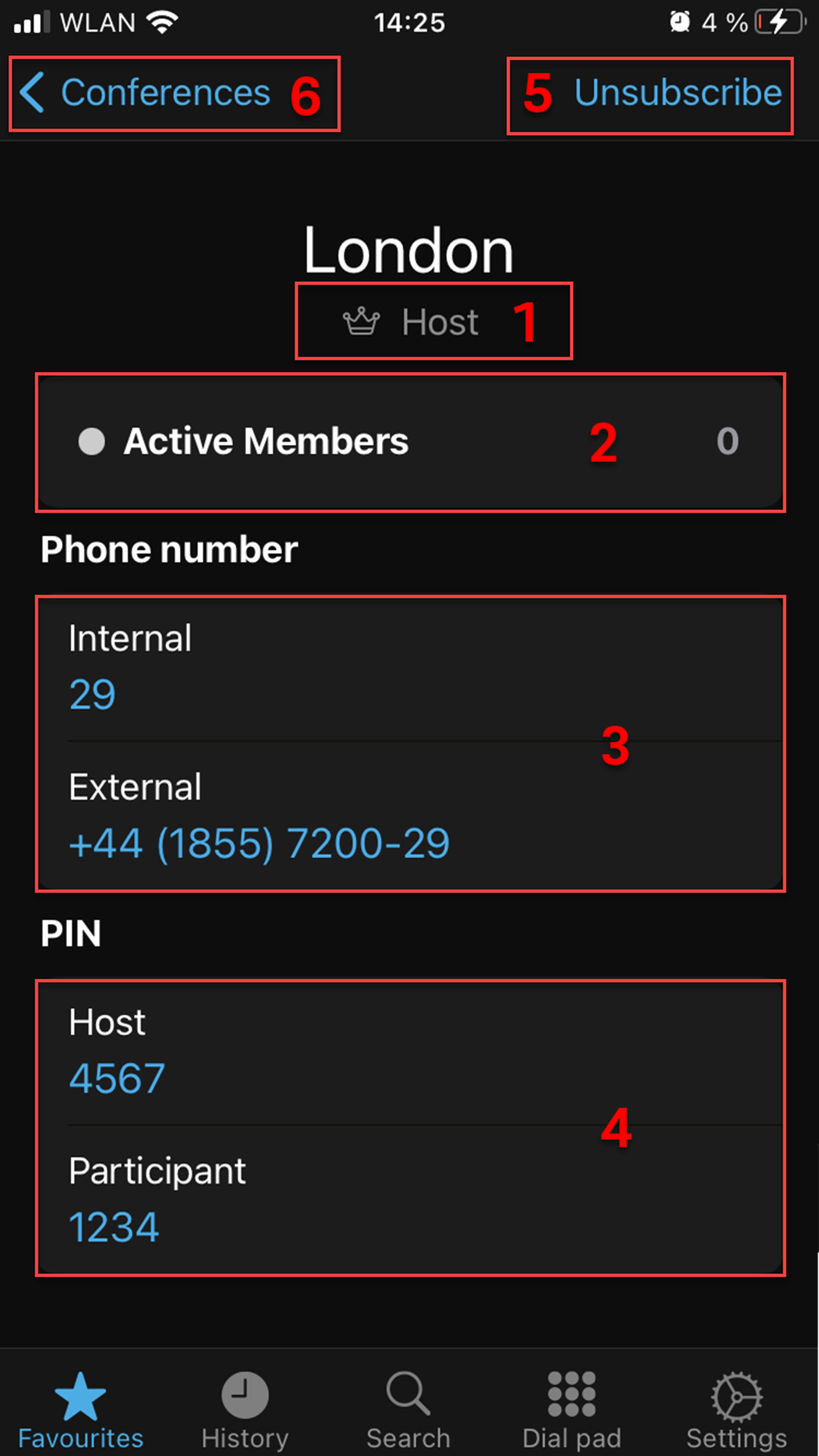 See the internal and external phone numbers to dial into the conference