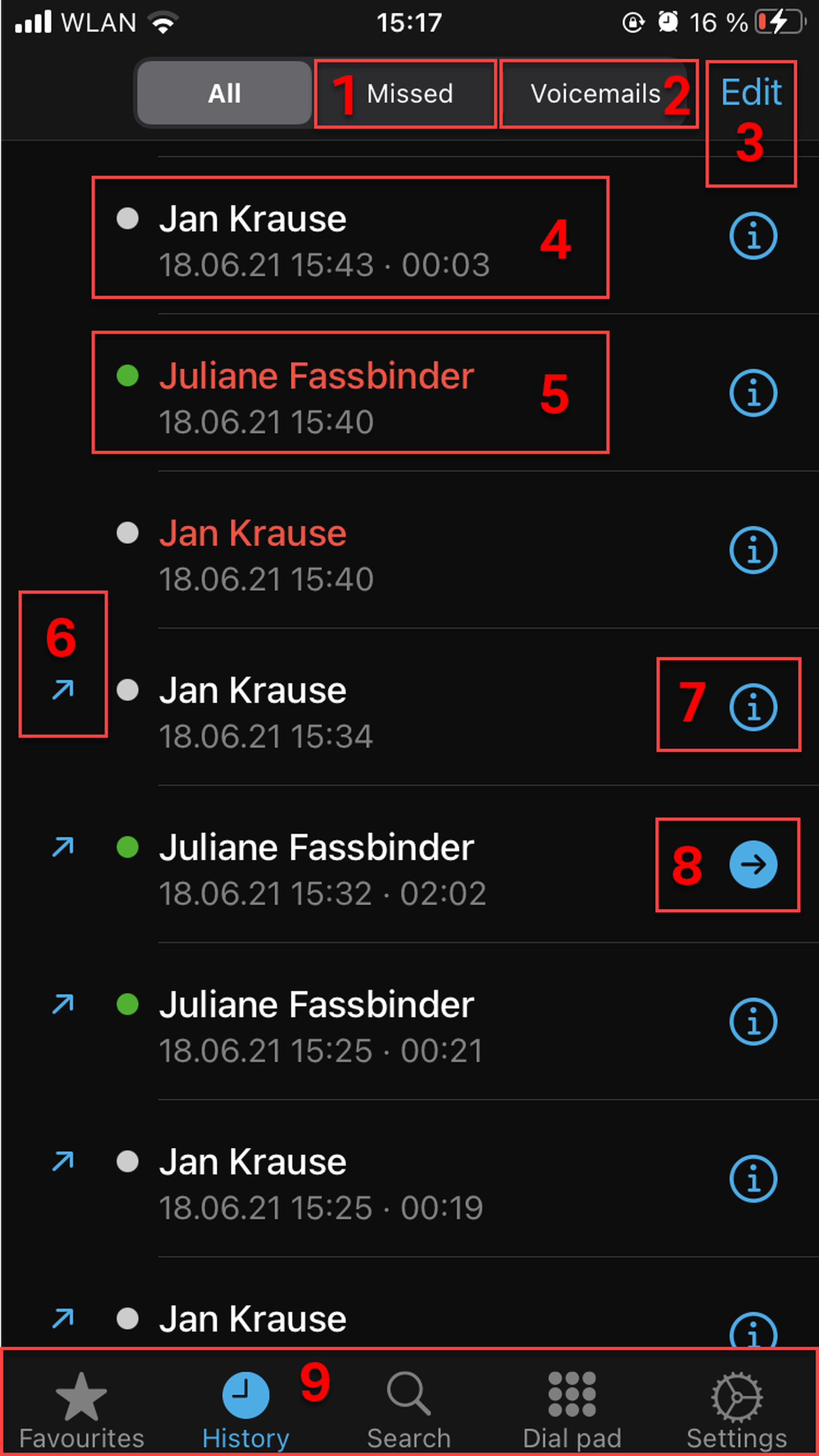 Edit the calls (delete all or select some calls and then delete them). You can also delete a specific call by swiping across the call entry from right to left. It is also possible to delete a call entry if you click on the info button or the arrow symbol on the right; the Delete entry option is shown then.
