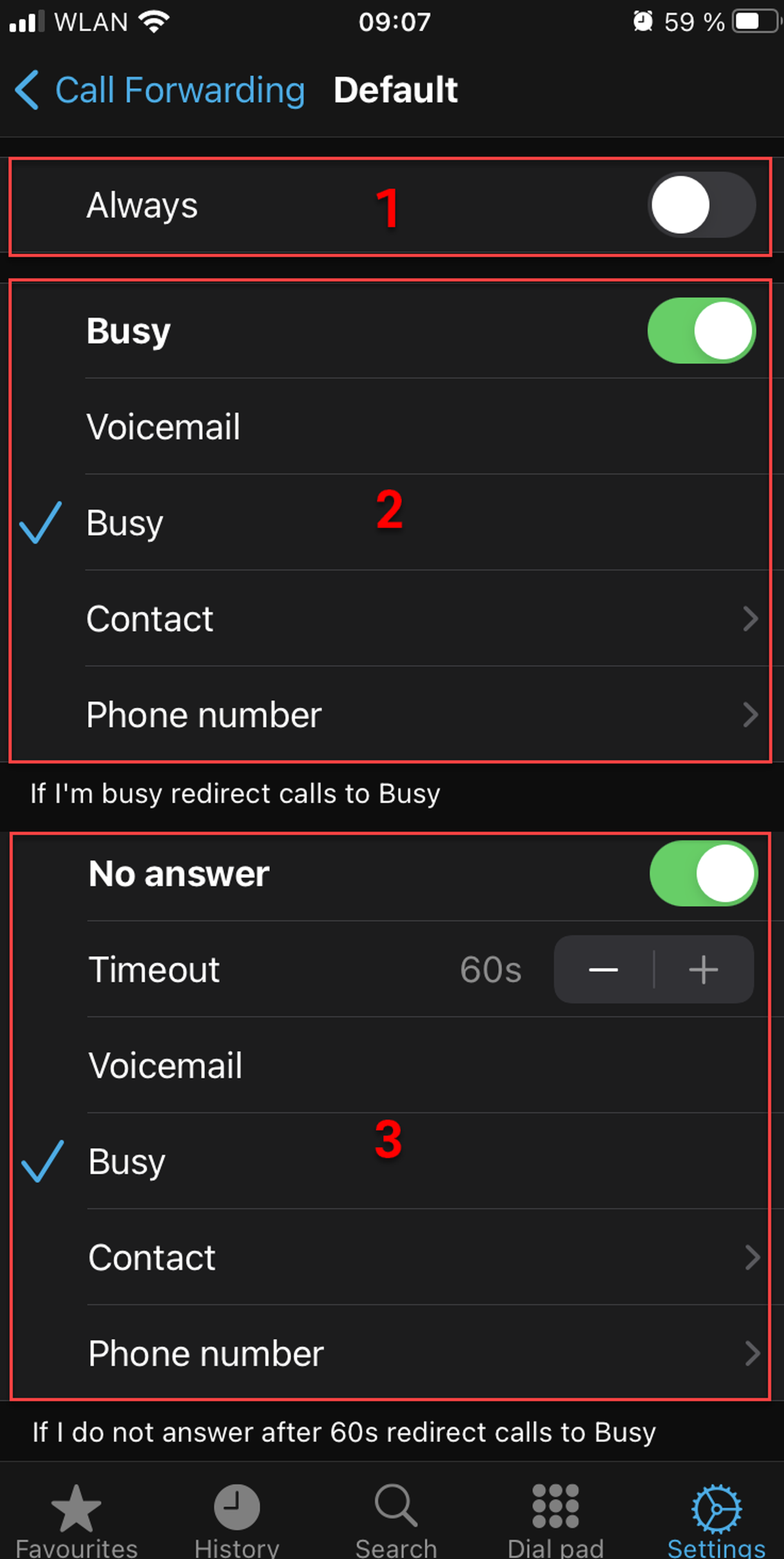 No answer. Here, you can enable/disable it, change the timeout between 5 and 60 seconds, redirect the calls to voicemail, busy, to a contact or a phone number.