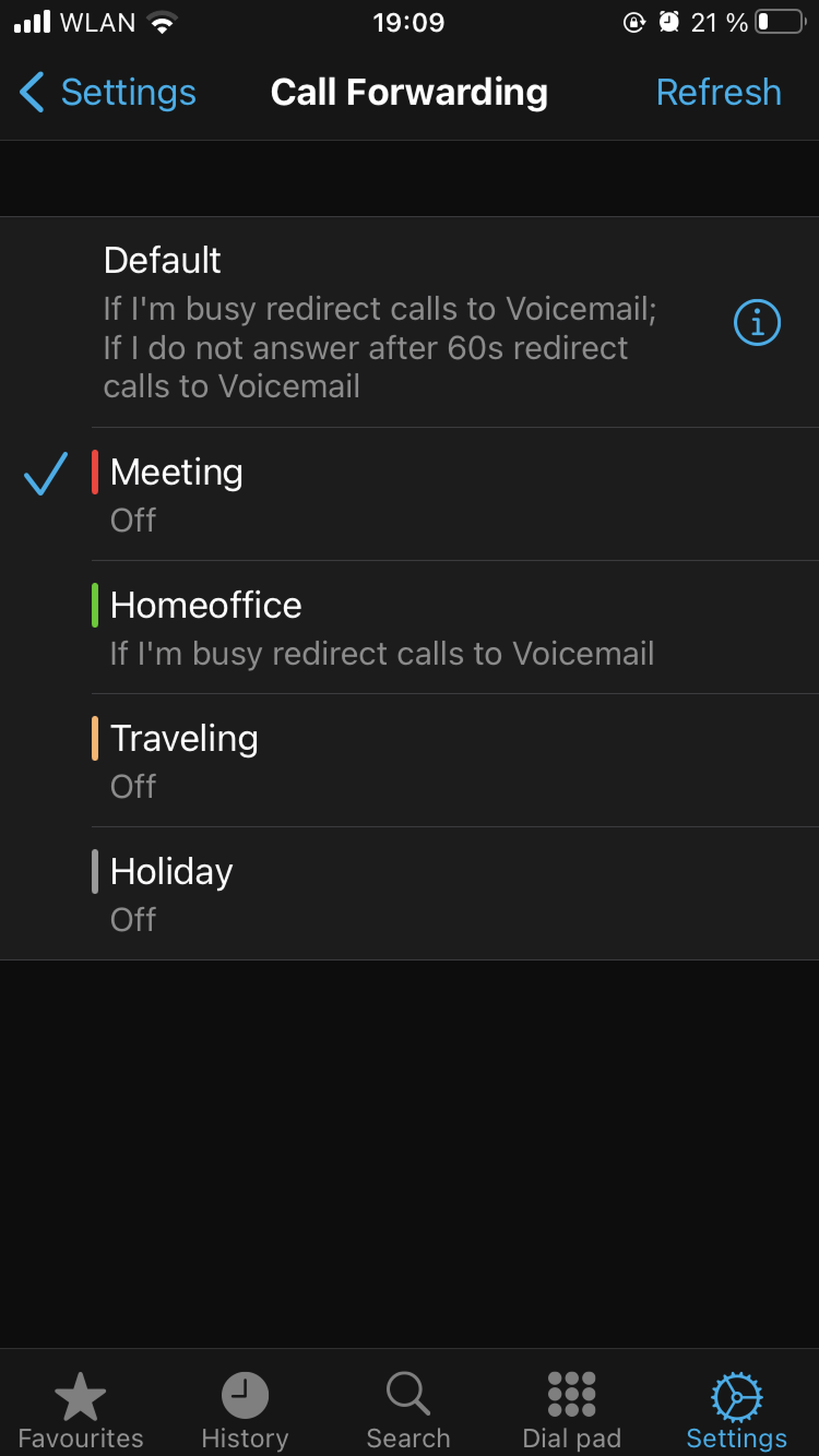 You can only edit the Default call forwarding profile in the app. Tap on the information button to edit the profile.