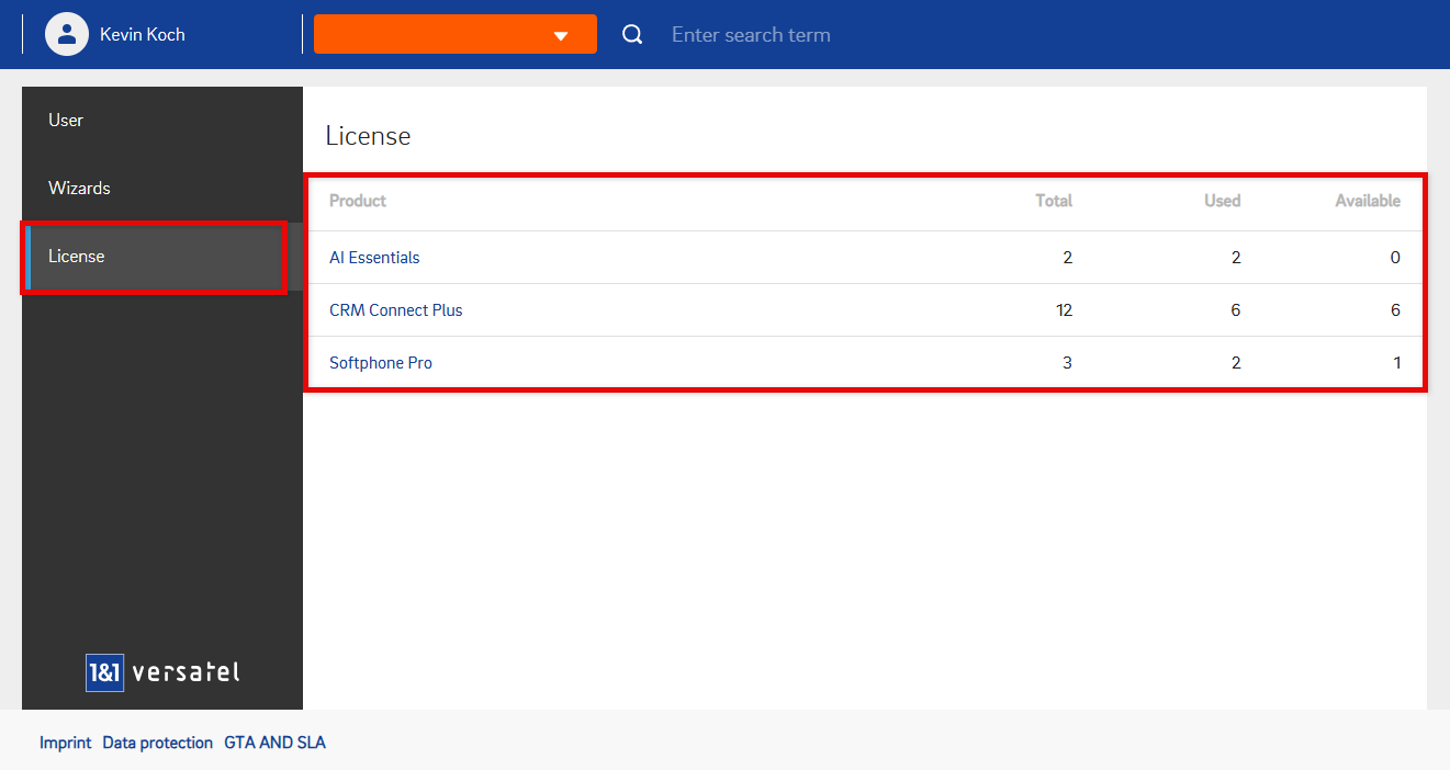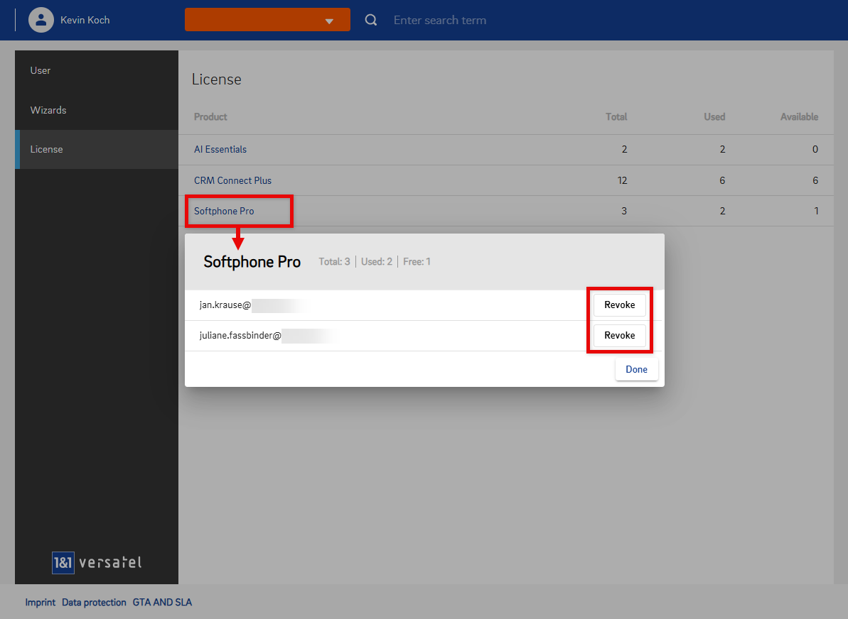 Click on a product (in the example here: Softphone Pro) to see which users have licenses.