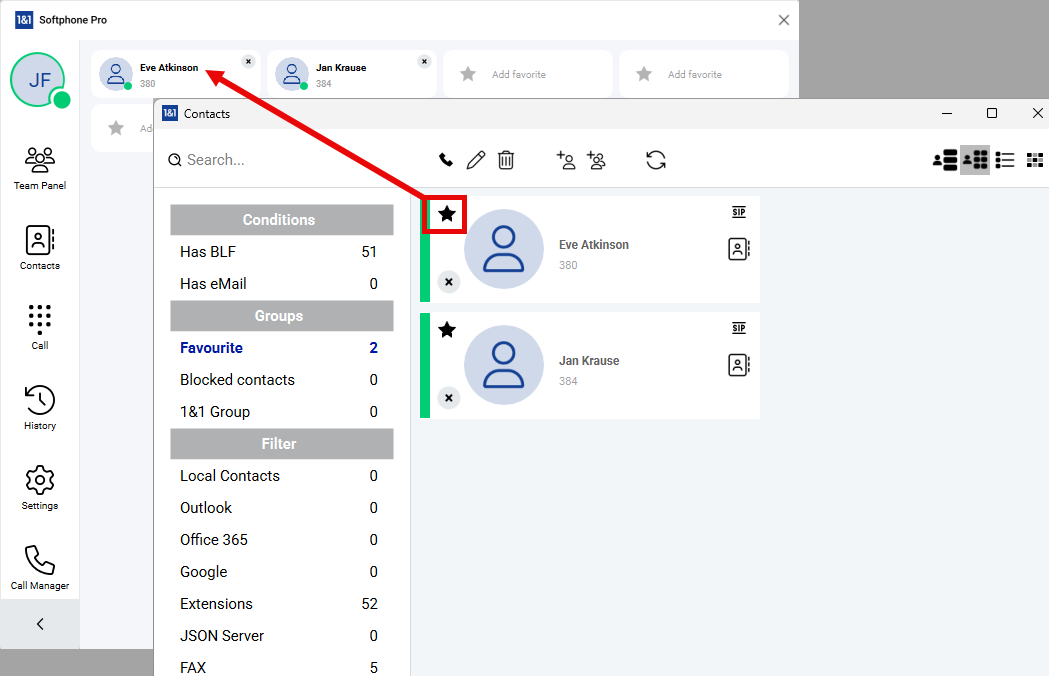 ⇒ The matching results are displayed in the favorites area.Click on the desired contact to open the contact information.