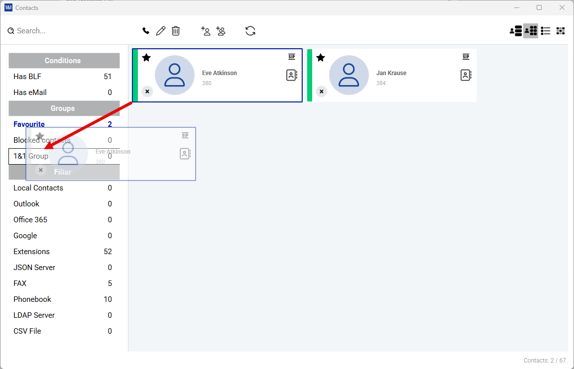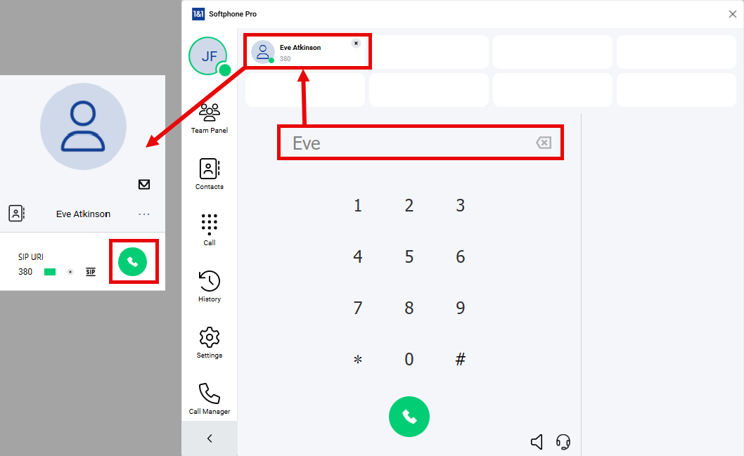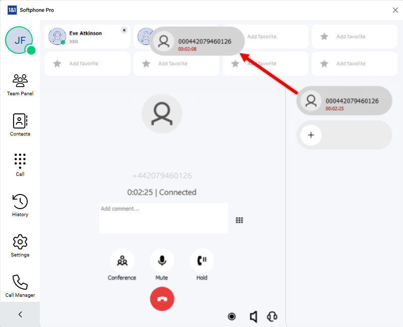 Drag the call tab to the desired transfer destination. Please note that the destination can be a contact (favorite in the keyboard, contact in the team panel, contact in the contact window), a call tab or any phone number in the keyboard or in the call manager.