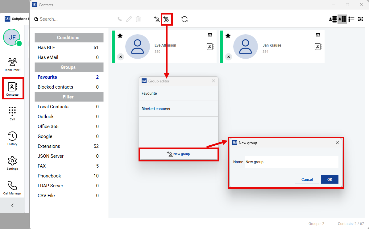 An information bar appears at the top of the screen that displays both contacts and contact groups.Contacts