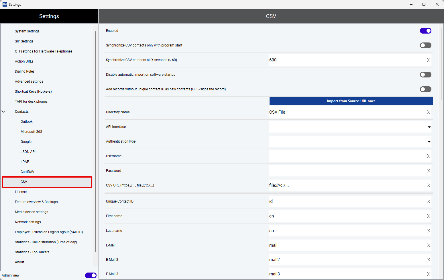 Click on Contacts -> CSV in the side menu to access the CSV synchronisation menu