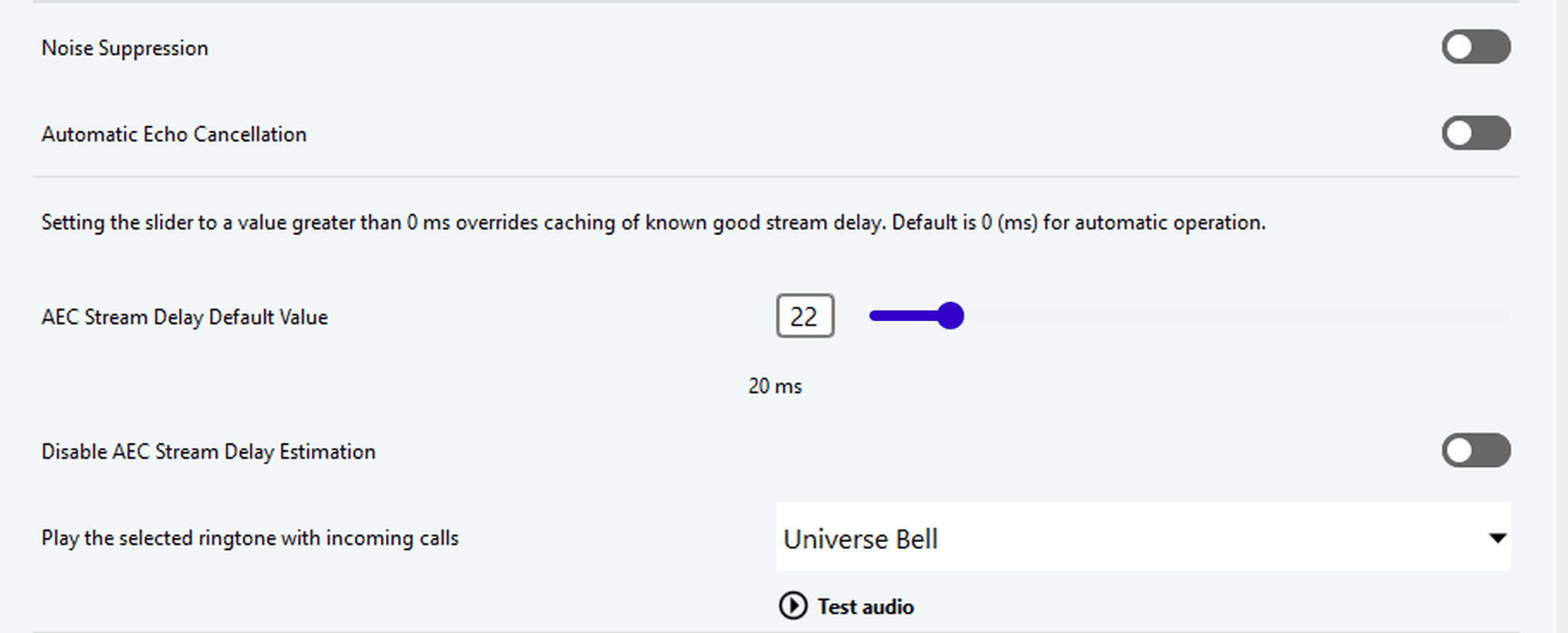 Disable AEC Stream Delay Estimation | Disables automatic AEC stream delay. Will use the delay provided with 'Default for AEC Stream Delay' instead. |