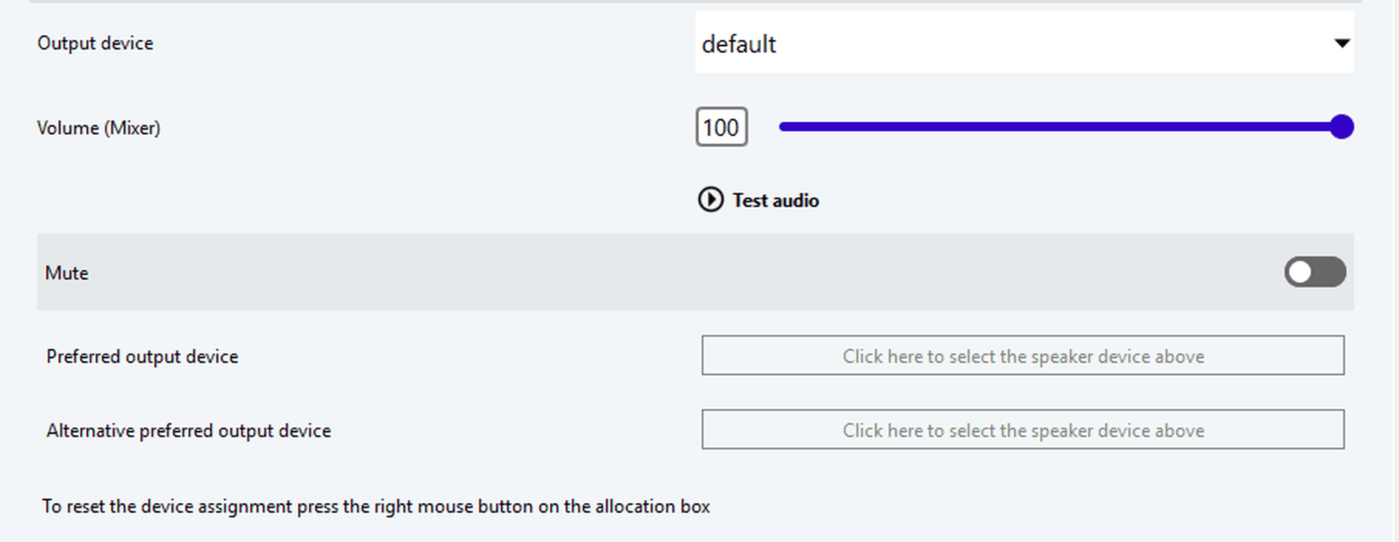 Alternative preferred audio output device | Select an alternative audio output device if the preferred one is not available. (For example, microphone of the notebook) |