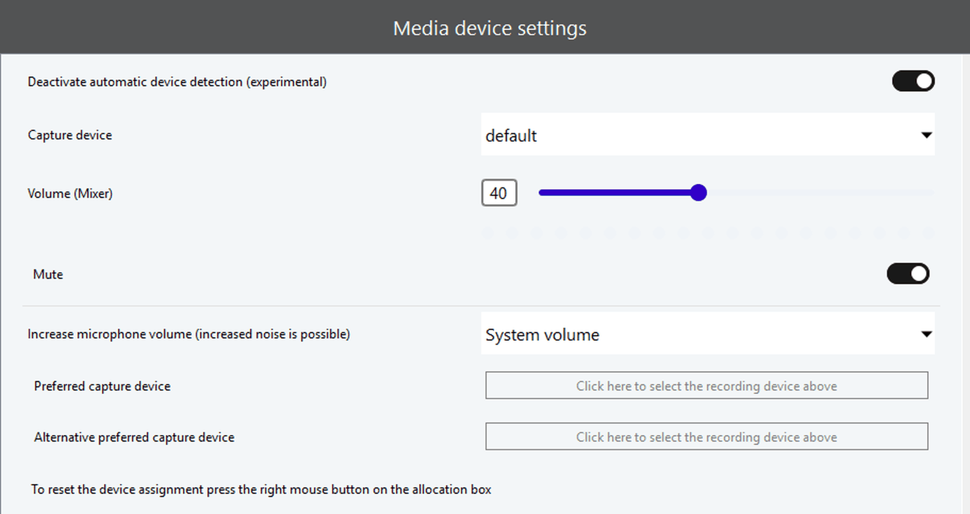 Alternative preferred audio input device | Select an alternative audio input device if the preferred one is not available. (For example, microphone of the notebook) |